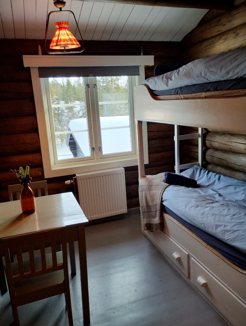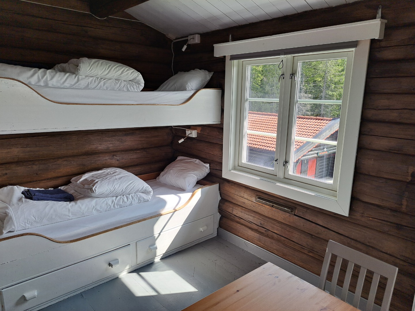 Plassbygde køyesenger i god tradisjonell hyttestil i heltre. Oppredde senger med håndkle